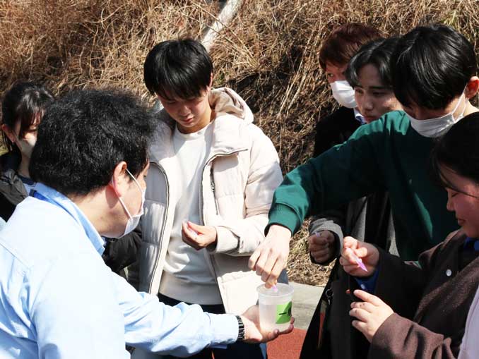 モニタリングフィールドの水質モニタリングエリアで採水した水を使って、CODパックテスト、pHによる水質測定を行ないます。
