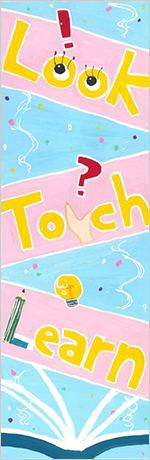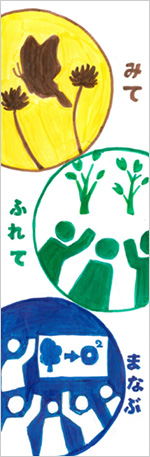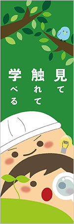 見て触れて学ぶをピクトグラム風にかきました。ピクトグラムはひと目見たときに誰にでも分かりやすく伝えることができるので、のぼりのデザインに適していると思います。