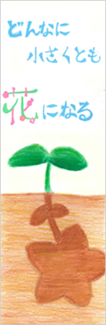 まだ小さい、希望のある「ふたば」をこれからも大きくなる「福島県」と重ねて描きました。影は大きくなった「ふたば」を表しています。