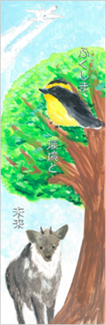 ふくしまの環境をカモシカやキビタキで表現しました。飛行機が飛んでいることで、未来を表現しました。